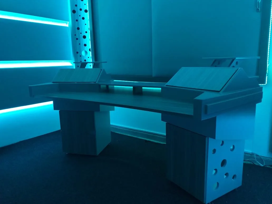 Distribución sugerida 3 niveles: superior (monitores, audio y video); medio (consola de mezcla y dispositivos de rack); inferior controlador MIDI o sintetizador