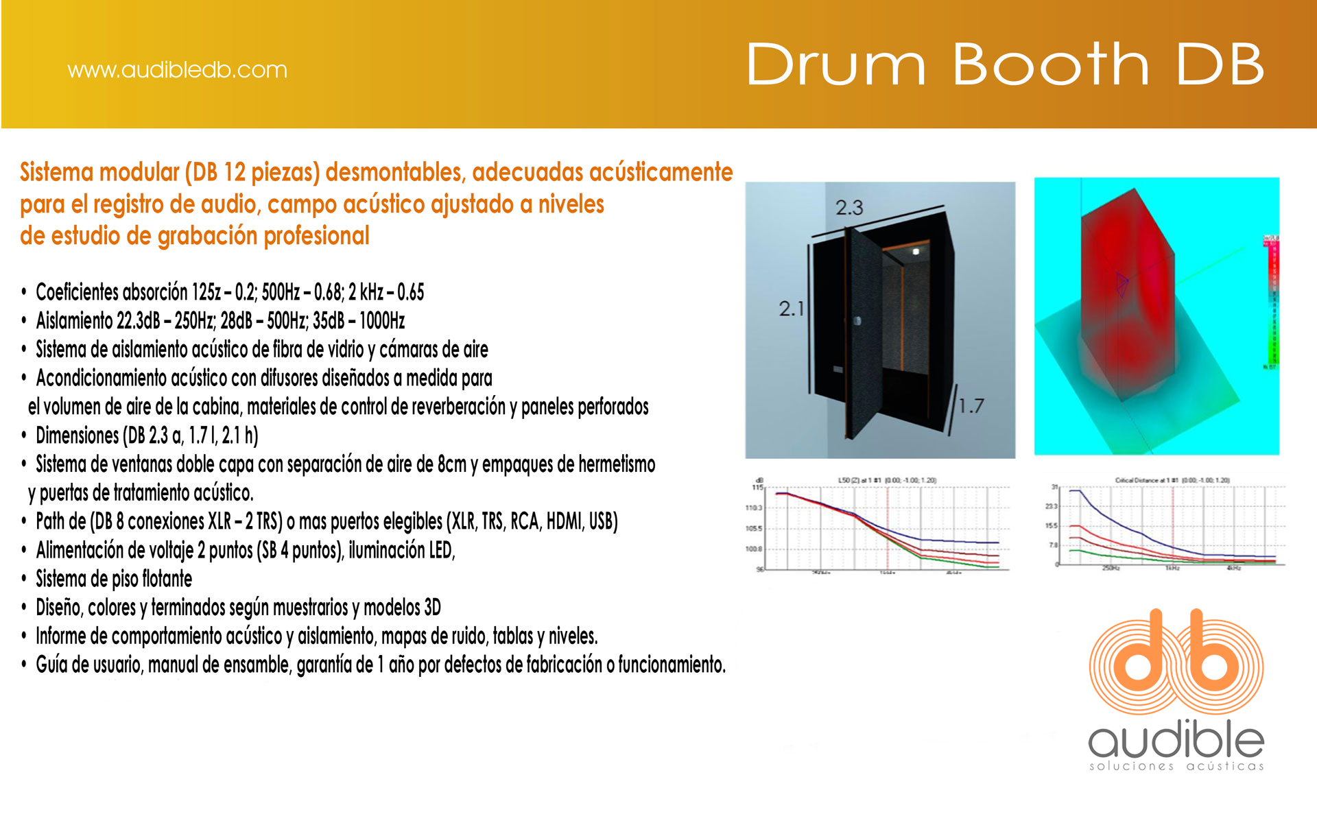 • Aislamiento 250Hz – 22.3dB; 500Hz – 28dB; 1KHz – 35dB